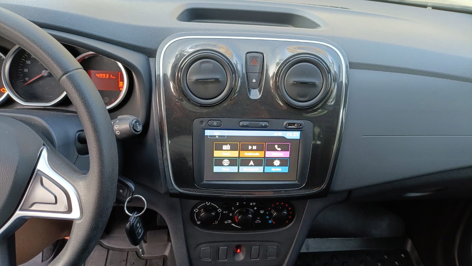 Dacia Sandero 1.0 75cv de 2019 es un coche utilitario de gasolina con motor de 75 CV , que destaca por su bajo consumo y espacio interior para su segmento. Las características principales incluyen un motor de 3 cilindros, 998 cm³ de cilindrada, cambio manual de 5 velocidades, vehículo de 1 solo propietario cuidadoso y que llevaba los mantenimientos al día ,consumo medio de 5.3 l/100 lo que es bastante bajo para un vehículo de gasolina , vehículo cómodo y ligero con mantenimiento fácil y económico, equipado con